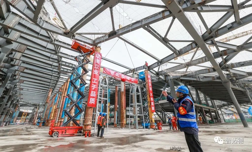 走進施工現場,主報告廳的最大跨度達到47.6米,懸挑21米,極具視覺沖擊力。“由于限高和使用空間要求,我們決定使用多排的單根‘工’字鋼作為屋面鋼結構,減少屋面占用室內空間。”張帥介紹,項目采用鋼筋混凝土組合梁的形式制作了一個特殊的“屋頂”,依靠混凝土的抗壓性來承載未來屋面上的綠化重量,同時借助鋼結構抗拉性強的特點托起混凝土,將屋面整體的重量通過兩側立柱進行分散,打造出堅固的體系。